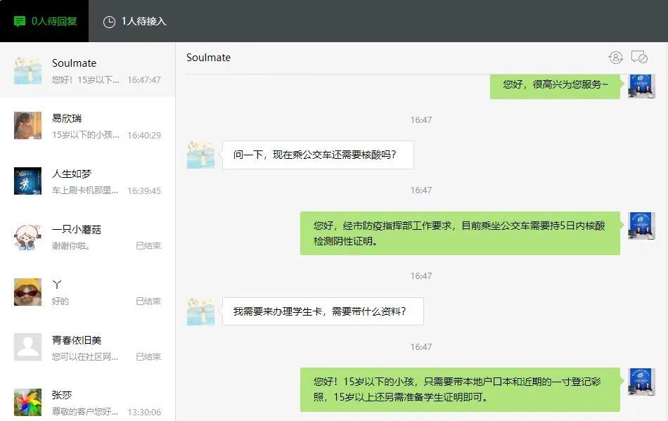 8月份升級(jí)開通網(wǎng)絡(luò)人工客服,市民通過荊門公交微信公眾號(hào),與人工客服1號(hào)、2號(hào)坐席進(jìn)行溝通,建立起集咨詢、尋物、建議、投訴等一體化的綜合在線服務(wù)。